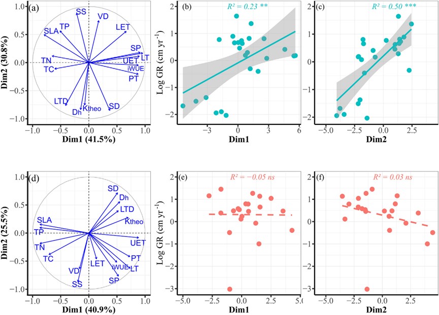 进一步研究发现,热带喀斯特森林中常绿树种的雨季生长速率与耐旱性状显著相关:导管密度越大、叶片厚度越大、水分利用效率越高,雨季生长速率越大;而导管直径越大,生长速率越小。这意味着常绿树种的生长依赖“耐旱能力”,安全的水力系统与保水的叶片结构让它们在干旱的环境中得以持续生长。落叶树种的生长速率与耐旱性状无显著的相关关系——它们更多是通过“落叶避旱”的策略,在雨季快速利用水分生长,较少依赖复杂的耐旱性状的调控。