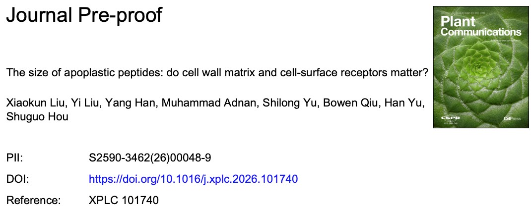 针对这一问题,江西省、中国科学院庐山植物园的刘小坤团队、刘毅团队与北京大学现代农学院的侯书国团队在国际著名的植物期刊《Plant Communications》(一区,IF=11.6)上发表了题为“The size of apoplastic peptides: do cell wall matrix and cell-surface receptors matter?”的观点文章,首次提出了决定植物信号肽大小的两个关键制约因素,并分析了其尺寸演化背后的物理化学原理。文章指出,植物信号肽的理想尺寸是一个精妙的平衡点,它由两个连续的“过滤器”共同决定:一是其在细胞质外体内自由移动的能力,必须能有效穿透细胞壁基质构成的物理屏障;二是其与细胞表面受体结合的兼容性,必须具备精确的三维结构以激活下游信号。