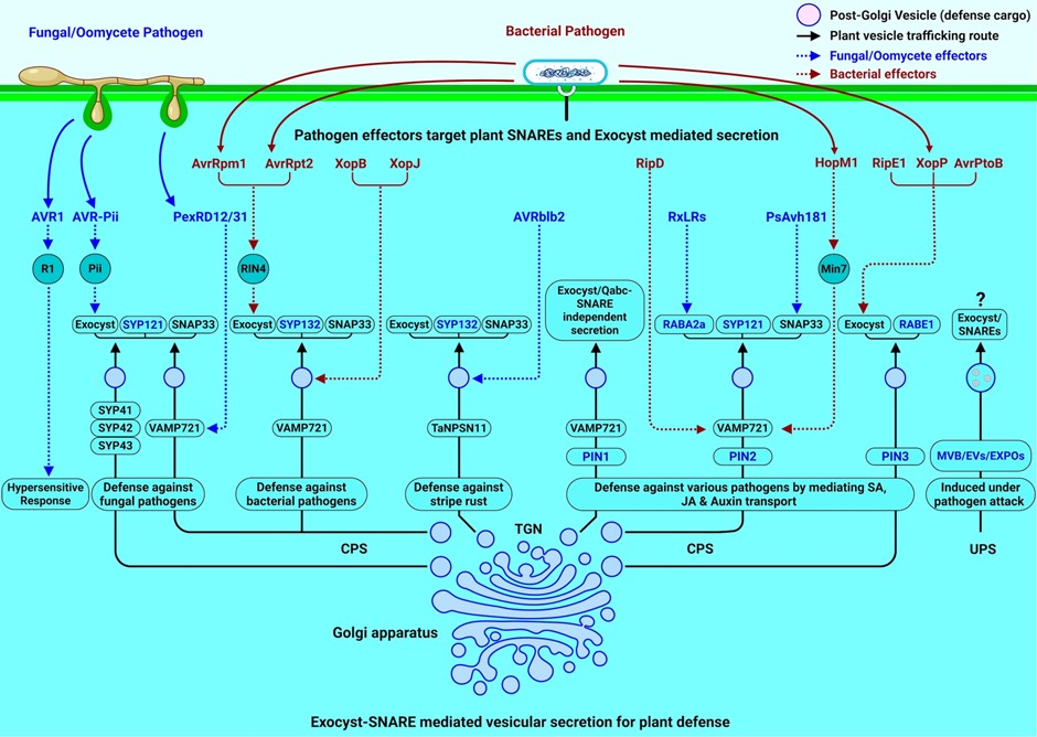 本综述整合了近期研究进展,拓展了这两种复合体在经典与非经典分泌途径中的功能谱系。文章还纳入了 Rab GTP 酶、植物 Rho 类 GTP 酶(ROPs)、磷脂酰肌醇类脂质、细胞骨架成分以及翻译后修饰等调控因子,构建了一个理解外排体–SNARE 在植物防御中协同作用的综合框架。同时,本文也强调了若干尚待解决的关键问题,例如体内完整外排体–SNARE 复合体的分子编舞机制、免疫货物选择的规则,以及胁迫条件下分泌通路的动态重编程。
