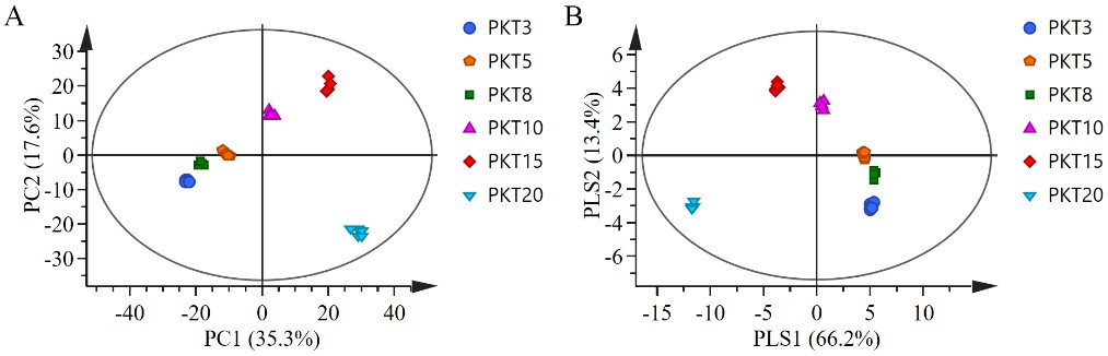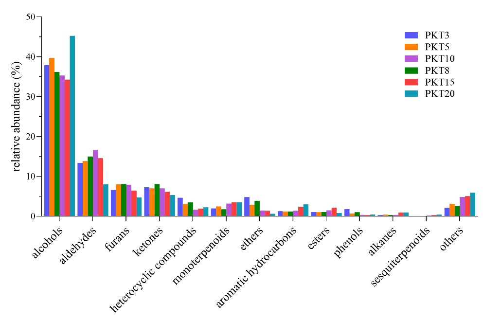 研究通过HS-SPME-GC-MS技术,共识别出189种挥发性成分,筛选出46种对年份区分具有关键贡献的差异挥发物,证实蒲坑茶风味源于复杂的醇、醛、酮等多类物质协同作用。随着储藏年限增加,挥发性成分呈现系统性重组,不同年份样品的香气谱可实现清晰区分,明确了陈化过程的定向演变特征。