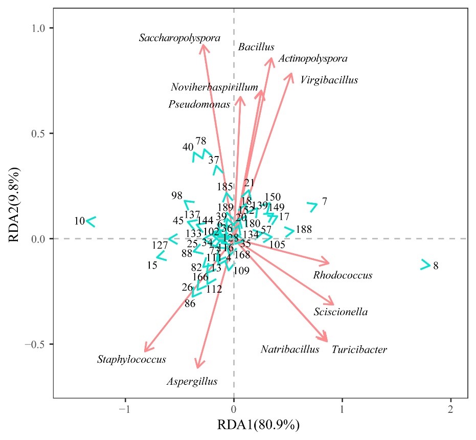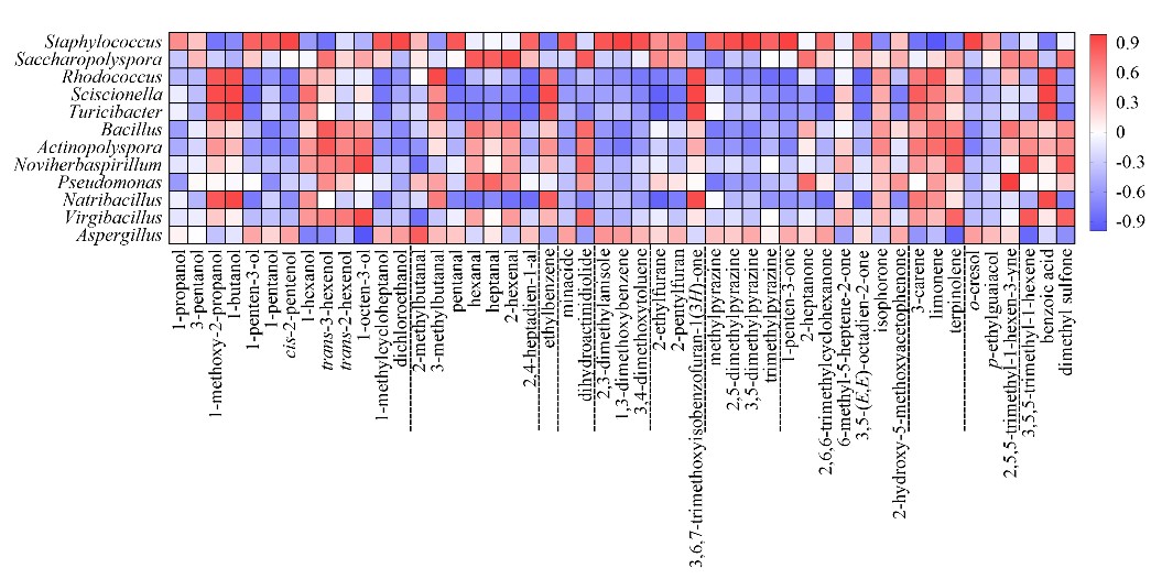 通过冗余分析(RDA)与Pearson相关性分析,研究进一步构建了微生物群落与挥发性成分的关联网络,证实优势菌属通过脂质氧化、氨基酸代谢等关键途径,调控香气物质的生成与转化。其中,Staphylococcus(葡萄球菌属)与醛类、醇类等香气活性物质呈显著正相关,Saccharopolyspora(糖多孢菌属)则参与香气前体物质的次级代谢,二者与 Aspergillus(曲霉属)的协同作用,共同驱动蒲坑茶陈化过程中的风味成熟。