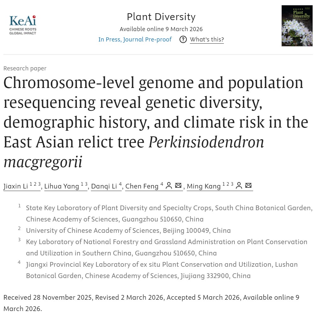 近日,华南植物园(康明研究团队)与庐山植物园(冯晨研究团队)合作,成功组装了银钟花的染色体水平参考基因组,并通过对全国30个种群167个个体的重测序分析,系统揭示了该物种的遗传多样性格局、种群历史动态及未来气候变化下的生存风险。相关成果“Chromosome-level genome and population resequencing reveal genetic diversity, demographic history, and climate risk in the East Asian relict tree Perkinsiodendron macgregorii”发表于国际知名学术期刊《Plant Diversity》。DOI:https://doi.org/10.1016/j.pld.2026.03.001