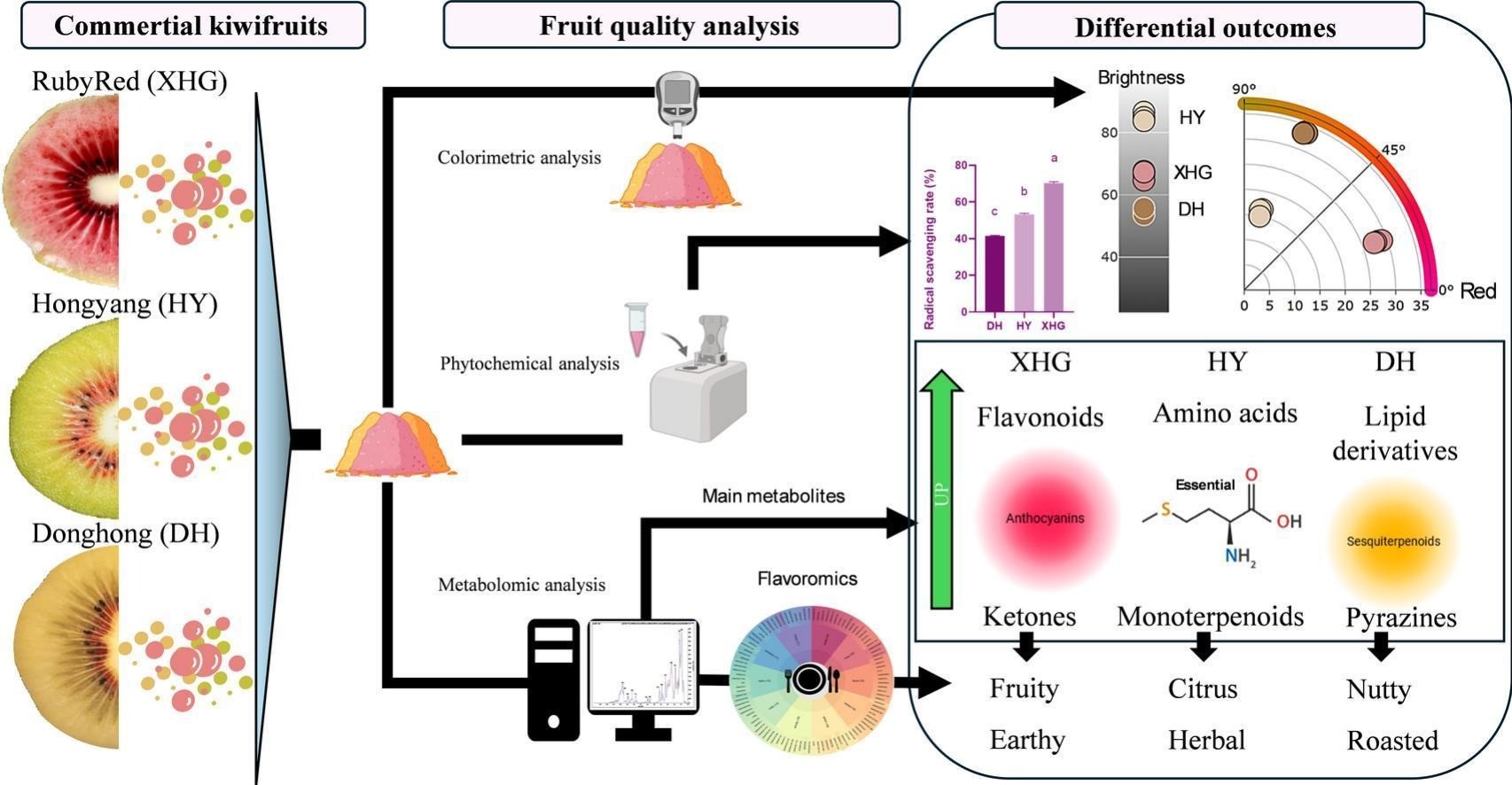 红肉猕猴桃因其鲜艳的果肉色泽和丰富的生物活性物质,正逐渐成为市场新宠。然而,不同红肉品种在颜色分布、风味特征和营养价值上存在显著差异,其背后的代谢机制尚不明确。本研究选取了红心猕猴桃品种“东红”(DH)、“红阳”(HY)和全红肉品种“RubyRed”(XHG),结合UPLC-MS/MS和GC-MS代谢组学技术,首次系统比较了它们的生化特性、非挥发性和挥发性代谢物谱以及氨基酸组成。